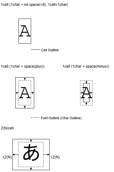 文字間スペースが0の時、フォントの外枠とセル(文字)の外枠は同一です。 文字間スペースを設定すると、フォントの外枠にスペースを追加(削除)できます。